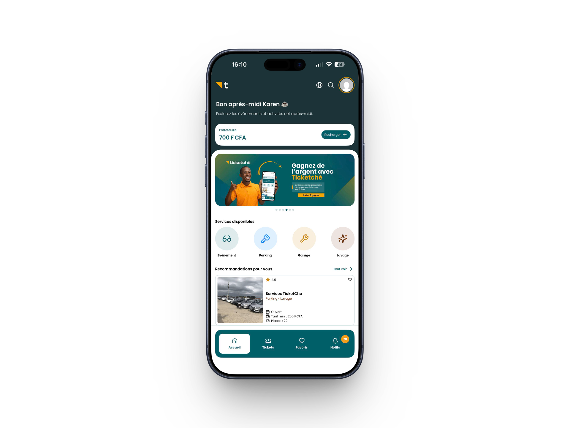 J'utilise Ticketché pour tout : je trouve un parking en 30 secondes, je réserve mon lavage auto le week-end et j'achète mes billets de concert sans bouger de chez moi. Une app indispensable !