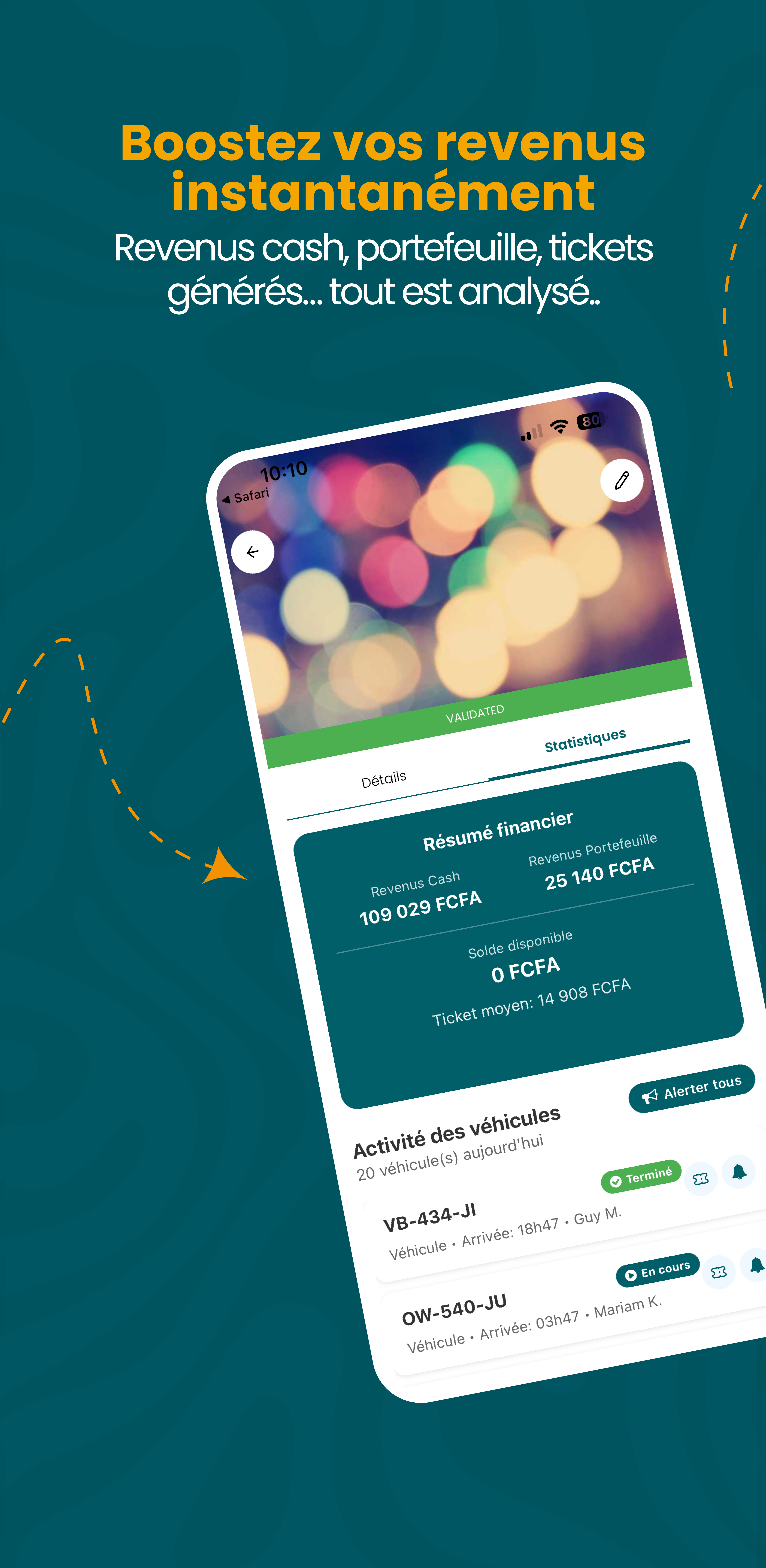 Les gérants de parkings, centres de lavage, garages et organisateurs d'événements disposent d'un espace dédié : suivi en temps réel des véhicules et entrées, encaissement mobile money, statistiques de fréquentation, gestion du personnel et billetterie numérique sécurisée.